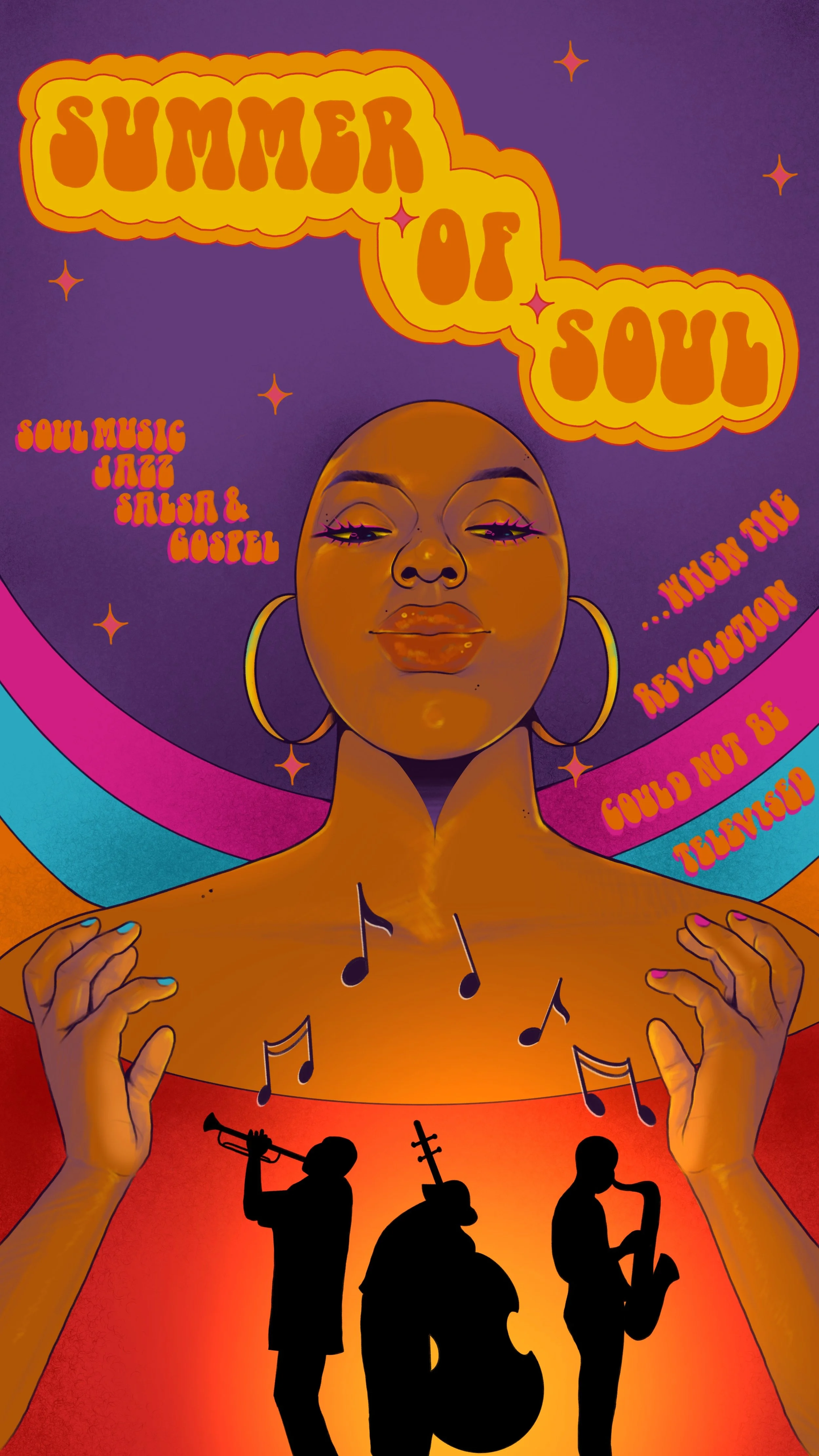 Summer of Soul is a documentary created and directed by Questlove. This film explores the importance of history to our spiritual well-being and stands as a testament to the healing power of music during times of unrest, both past and present. The feature includes concert performances by Stevie Wonder, Nina Simone, Sly & the Family Stone, Gladys Knight & the Pips, Mahalia Jackson, B.B. King, The 5th Dimension and more. I was commissioned to illustrate a poster for Hulu to promote their film Summer of Soul.